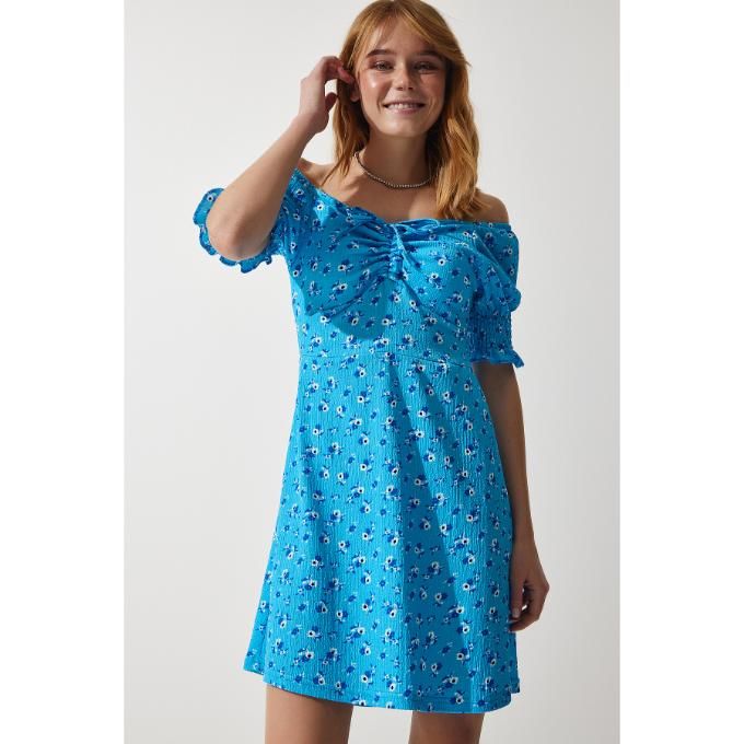 Women’s Light Blue Gathered V-Neck Patterned Knitted Dress