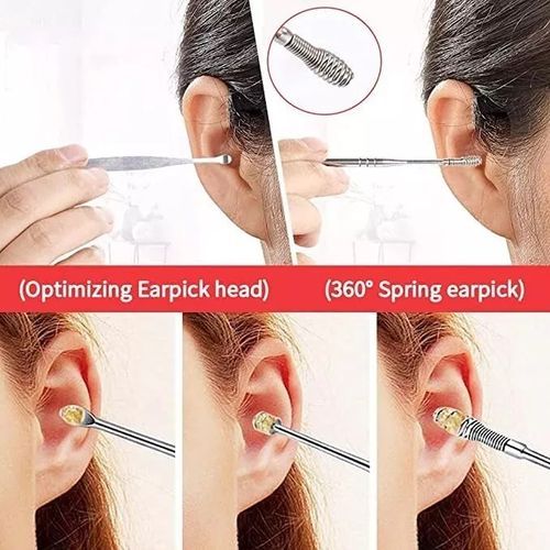 Ear Wax Earpick Removal have been fully polished to ensure all of the surfaces are smooth, to prevent any scratching or irritation to ear. Different shape ear picks ensures multi-directional cleaning, for different kinds of ear canal, convenient and fast, saving much time and effort. The handle is convenient to hold, comes with a PU leather storage bag, durable to use, easy to storage and carry. Our product has 6 earpicks in one set. Suitable for daily ear cleaning and ear canal cleaning. 1.360 degree spiral cleaning, the surface of the ear tip is smooth and does not sting when using. 2.The ear spoon enlarges the spoon-shaped head, and the cleaning effect is better. Describe: Name: 6-piece ear pick tool set Material: stainless steel Color: silver Function: portable ear care Quantity: 1 set (6pcs)