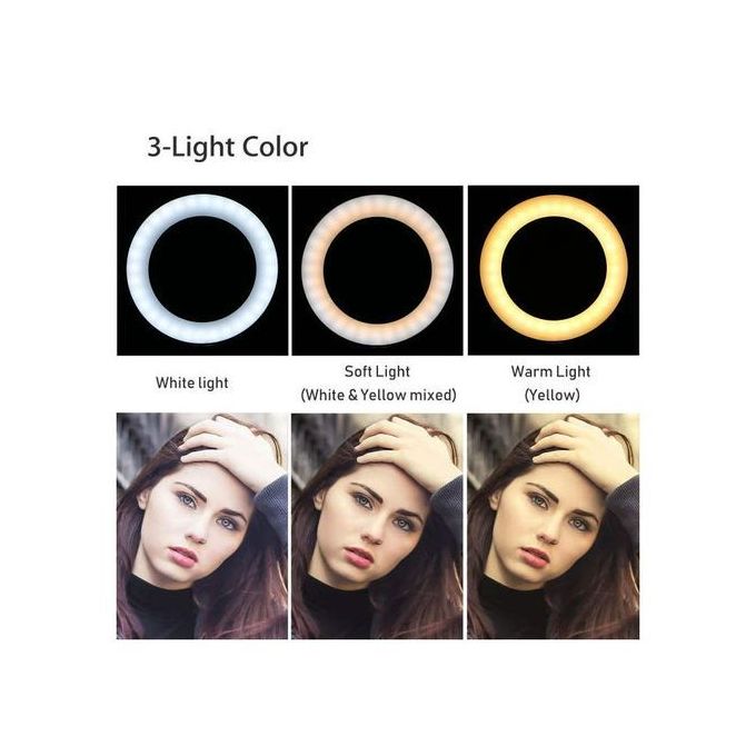 13 Inches M33cm Mobile Phone Live Broadcast Selfie Ring Light.(NO TRIPOD)Our Selfie Ring Light3 Colors, Stepless Dimming, White Light, Warm Light, Soft LightSpecial LED Design, Lightweight And Portable.Used In LED Light Bulbs. It Has 96 LED Lamp Beads For Long Life Without Changing Bulbs3 Colors Lighting Mode. Easy Control On Cord To Power On / Off Or Switch To The Light Mode You PreferThis Ring Light Makes Every Photo And Video Look More Professional.Makeup Light With Adjustable Tripod StandMulti-Scene Use Mainly Used For Macro, Self-Timer Beauty, Live Streaming, Makeup, Hairdressing Studio Fill Light, And Suitable For All The Light Of The EnvironmentThe Position Can Be Adjusted According To The Needs To Make The BetterUSB Powered, Works With Most Devices That Support USB PortCompatibility: Smartphones, Video And Photo CamerasColor Temperature: 5500K – 3200KLight Source Power: 10 WPower Supply: USB 5V, 2A …. Not IncludedThe Diameter Of The Ring: 26 CmPermissible Width Of The Smartphone On The Mount: From 5.2 To 10.5 Cm