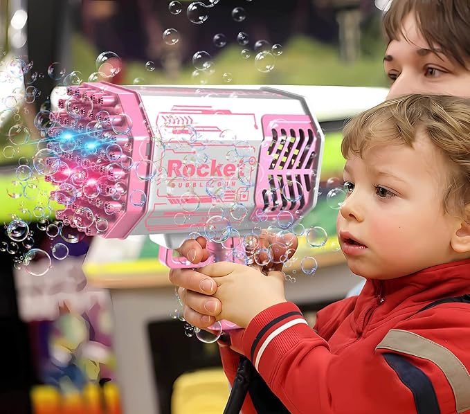 Package Included】Bubble maker × 1, 60ml bottle (containing bubble liquid) × 2, bubble concentrated solution × 20, plate × 1 , battery × 1, charger × 1, instruction manual × 1, please fully charge before usage.【Newly 69 Holes Bubble Machine Gun】With 69 bubble holes, the power is strong. At the same time with colorful glare, it can also be used at night. Let the bubbles go crazy and the kids have fun. Thousands of bubbles can be blown at the same time.【Safe & Durable ABS Material】 Bubble machine gun is made of ABS material, no sharp edges and corners, and no odor. Children can use and play with confidence, super fun to enjoy cool summer leisure time. Great fun bubble machine toy for kids this summer.【The Best Gift for Your Kid】With its safe and convenient design, it is the best gift for your kids. It can produce amazing effects:can generate 1000+ colored bubbles per minute, which help to create a marvelous atmosphere. This is a gift you will never forget.【Suitable for Any Occasion】Our product – the rocket bubble maker is suitable for every occasion: birthday parties, stages, marriage ceremonies, barbecues, Christmas Day, etc. With it you will become the focus of the day! And with its extraordinary effect it will help you produce perfect photos and videos.