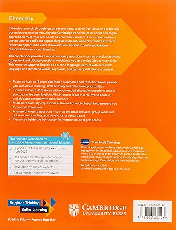 Editorial Reviews Extensive research through lesson observations, teacher interviews and work with our research community (the Cambridge Panel) means that this coursebook with digital access meets the real teaching needs of the chemistry classroom. Exam-style questions ensure students feel confident approaching assessment. New features provide reflection opportunities and self-evaluation checklists develop responsible learners. The coursebook provides a range of enquiry questions, such as practical activities, group work and debate questions that develop 21st century skills. It supports English as a second language learners with key command terms, accessible language and glossary definitions.