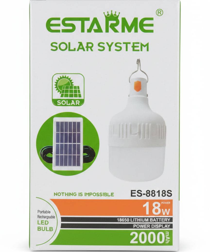 The ESTARME ES-8818S is a versatile, eco-friendly lighting solution designed for modern living. Combining a high-efficiency solar panel with a powerful 18W rechargeable LED bulb, this system provides bright, sustainable light for off-grid adventures, emergency backup, or everyday energy savings.