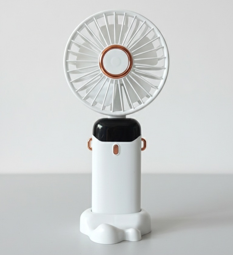 Key Features ​Dual-Purpose Design: Use as a convenient handheld fan while traveling or place it into the included non-slip base for hands-free desktop cooling. ​USB Rechargeable: Equipped with a built-in battery that charges via a standard Micro-USB cable, compatible with power banks, laptops, and wall chargers. ​Charming Aesthetic: Available in various stylish designs, including a sleek white model with rose gold accents and a playful pink version featuring a cute character emblem. ​Ultra-Portable: Lightweight and compact enough to fit in a handbag or backpack, making it an essential accessory for commuting, events, or office use. ​Efficient Airflow: Designed with multi-blade technology to deliver a steady, refreshing stream of air despite its small size.