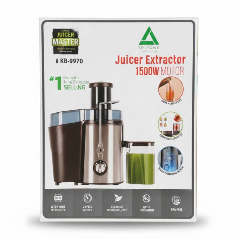 ​Experience the power of fresh nutrition with the TRIFONE KB-9970 Juicer Extractor. Driven by a massive 1500W professional-grade motor, this machine is designed to pulverize the toughest fruits and vegetables in seconds, delivering high juice yield with minimal waste. Its sleek stainless steel finish and robust build make it a premium addition to any health-conscious kitchen.