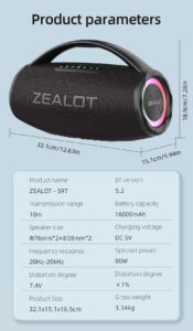1.75W Bass with Dual Pairing – To achieve the incredible 80W, Zealot S97 comes with an exclusive custom 2 woofers and 1 tweeter. Combine with DSP chip for top of the line bass stereo effect. Crazy and shocking. In addition, it is equipped with a dual pairing function, like a live concert experience, 160000 Mah Battery – More power, Better bass. What else? To support the perfect performance of the speaker, it uses a large capacity of 16000 mah battery as the base of the speaker, up to 50 hours of playback time, and can charge phones, tablets and other devices while playing3.Different Sound Effects – On Sound, Zealot all the investment is worth it. You want clear voices? Or a more bass effect. EQ button for you to achieve, 3 sound modes, to meet your listening preferences. The clear and dynamic mode light changes allow you to use at willAre you still worried? – Best Bluetooth 5.2 technology, up to 100 feet of connection